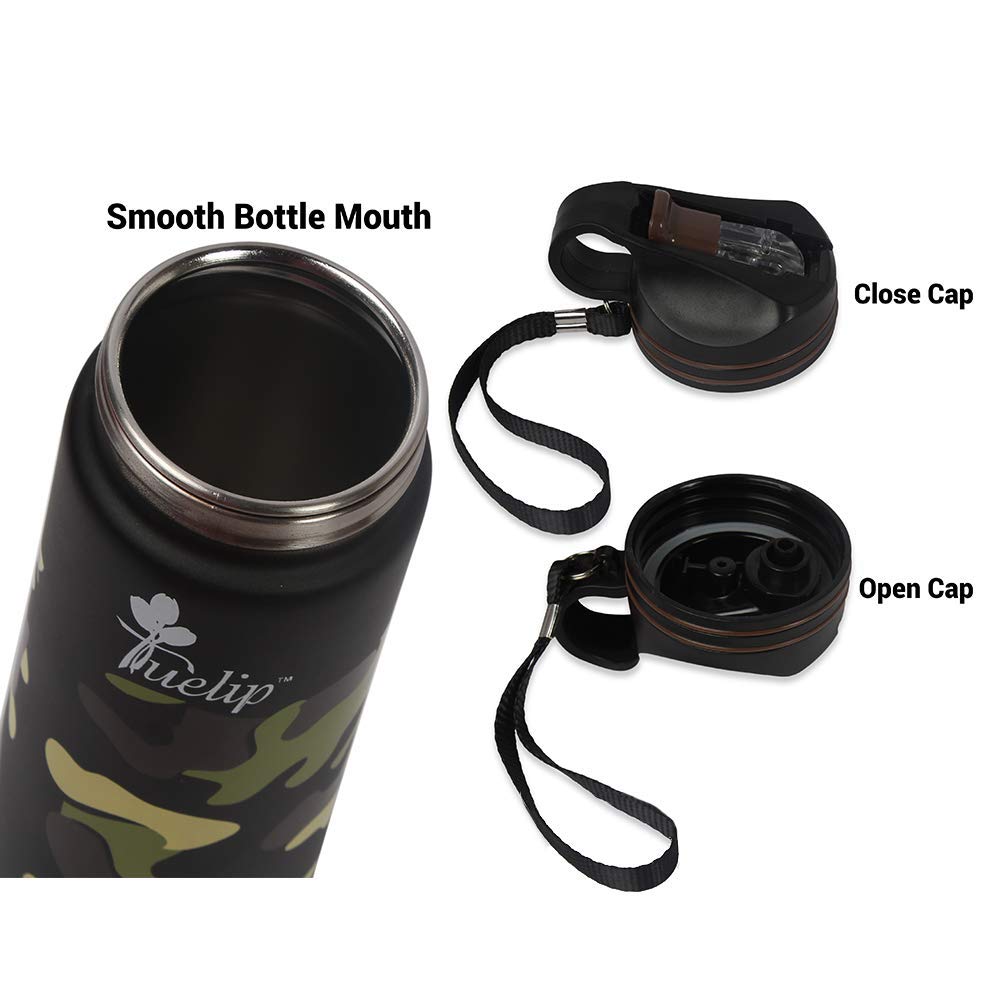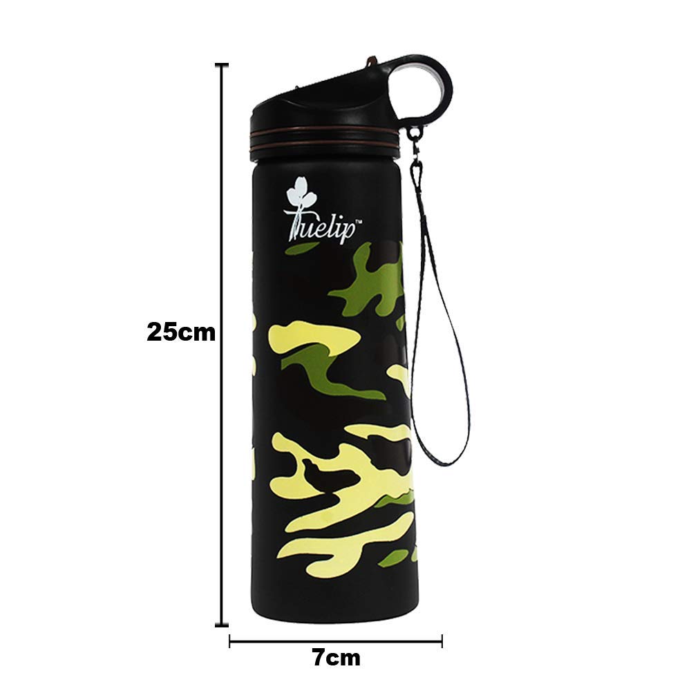 Tuelip Stainless steel Water bottle is sure to up your water intake and is very handy to carry along. Wide mouth of the bottle is convenient for filling and cleaning and a wide stable base that makes the bottle stand erect and prevent it from shaking. Premium quality Stainless Steel construction makes sure that your beverages remain hot or cold when you need them the most and you stay refreshed. Rust-proof and odor-free body keeps the liquids fresh and ready to be sipped when you need them the most. It is reusable and recyclable and ideal for taking it on picnics, tours and travel, train journeys, camping, vacations, gym workouts, school, college and office